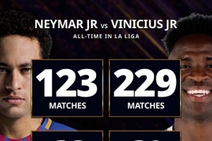 上一篇: 西甲数据对比:内马尔123场68球49助,维尼修斯229场69球46助