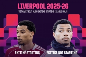 埃基蒂克本赛季英超首发时利物浦10战7胜2负,未首发6战1胜4负