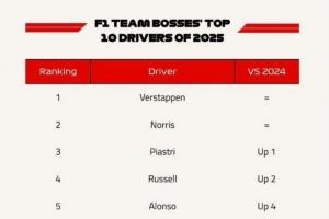 体育资讯12月29日讯 F1官方公布了本赛季的年度车队领队评分,其中,维斯塔潘排名第一,诺里斯第二,皮亚斯特里第三。