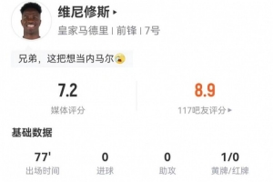 维尼修斯本场8过人5成功 13对抗7成功+3犯规2造犯规 获评7.2分