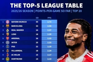 本赛季五大联赛球队场均拿分榜:拜仁、巴萨、皇马列前3,枪手第5