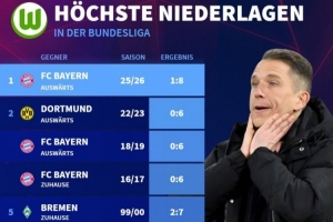体育资讯1月12日讯 本轮德甲焦点战,狼堡在客场1-8惨败拜仁,也创下了他们队史最大比分输球纪录。