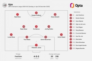 据opta数据统计,这是阿贾克斯队史首次在欧冠首发中派出两名17岁或17岁以下的球员。