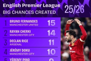 上一篇: 本赛季英超创造重大机会榜:B费15次居首,谢尔基、赖斯二三位